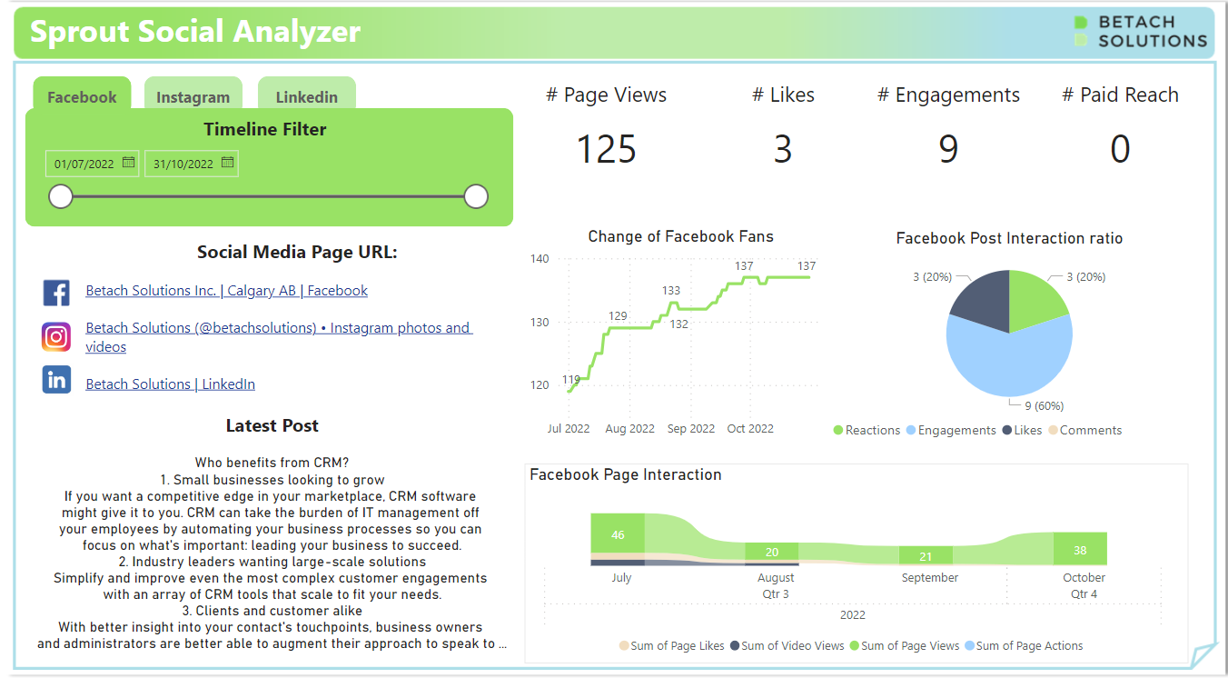 Our new integrated Power BI dashboard provides a dynamic and real-time snapshot of your social media performance across Facebook, Instagram, and LinkedIn. The Sprout Social dashboard, embedded within our CRM, enhances accessibility and offers a simplified view of data from different platforms, all in one place.